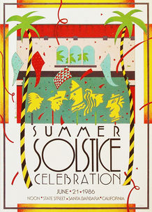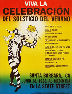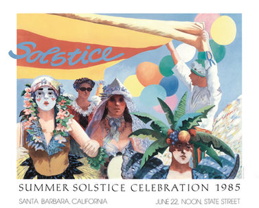 David Mark Lane, an artist and architect, was born in Hartford, Connecticut. He has worked and lived in Santa Barbara, California since the '90s. For this year’s poster art, David worked with his hand-drawn sketches and completed the work in Photoshop. He has created a new media form he likes to call 'primitive digital.” David says, “This artwork recalls the era when the Solstice Celebration began. I’m so happy to be selected this year. Number 3 is a charm. It’s my 3rd time entering the contest."