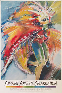 An Art Director whose creative career took him from London to New York City to Santa Barbara to San Francisco, Elsey has fond memories of Santa Barbara through the years and had this to say about his Solstice poster: "I am honored to be selected by the Summer Solstice Committee to design their 2018 poster and T-shirt. In my painting, I wanted to capture all the excitement, color and spirit of the wonderful solstice parade of carnival characters. This has been a year of so much tragedy in our small community, so this year the solstice theme is Heroes- paying tribute to all the courageous men and women who came to our rescue."